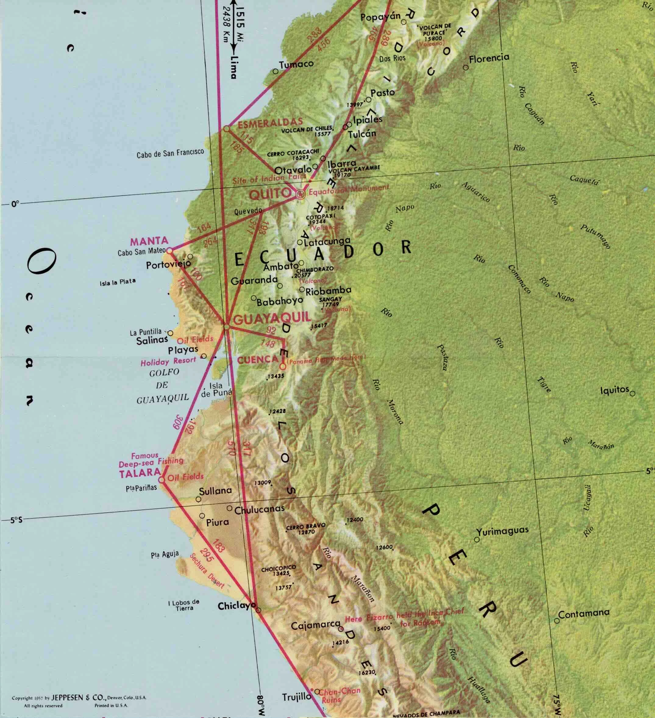 An airway map depicts the well traveled routes in Ecuador. Book FlyBraniff.com to fly to Ecuador. Photo: Braniff Airways, Incorporated, Copyright